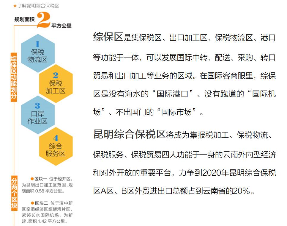 昆明綜合保稅區(qū)規(guī)劃面積2平方公里,按功能劃分為保稅物流區(qū)、保稅加工區(qū)、口岸作業(yè)區(qū)、綜合服務(wù)區(qū)。又分為兩個區(qū)塊,區(qū)塊一位于經(jīng)開區(qū),為昆明出口加工區(qū)范圍,規(guī)劃面積0.58平方公里。區(qū)塊二位于滇中新區(qū)空港經(jīng)濟(jì)區(qū)螺螄灣片區(qū),緊鄰長水國際機(jī)場,為新建,面積1.42平方公里。
